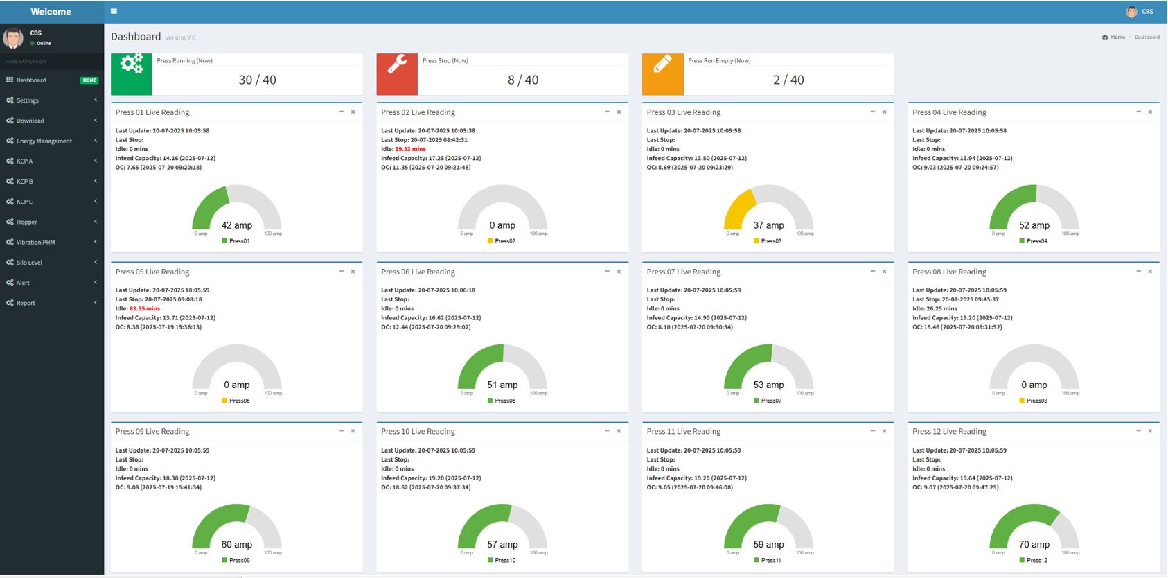 normal current condition, yellow indicating press in empty mode, red indicating